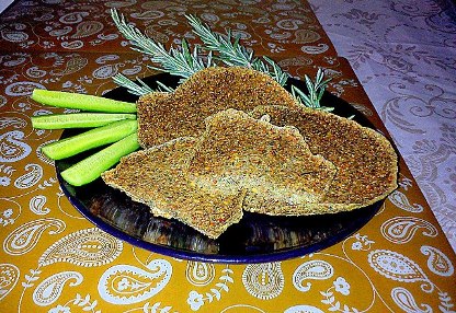 | 200 гр льна заливаем 400-500 гр воды на ночь или часов на 6-8. Пекан заливаем на те же 6-8 часов - после этого промываем и немного обсушиваем. Нарезаем кабачки, цветную капусту, брокколи - кладем в блендер (скорее всего, это нужно будет делать частями - поэтому распределим замоченный лен на столько частей, сколько будет закладок овощей в блендер) вместе с замоченным льном. Перемалываем, подливая каждый раз немного водички (наши 1 - 1,5 стакана тоже нужно будет распределить на количество закладок). В последнюю закладку кладем пекан, чеснок, чили перец и остатки воды. Все перемешиваем в отдельной большой миске. Добавляем молотые специи, соль, гречневую и льняную муку. Должно получиться тесто, по консистенции похожее чем-то на манную кашу. Формируем на листах дегидратора оладьи, толщиной 1 см. Ставим температуру 39 гр и подсушиваем 12-13 часов. После этого переворачиваем и сушим еще часов 7. С салатом или просто овощами - превосходно!! Муж со свекровью съели половину подносов)))) Оладьи получаются подсушенные с двух сторон, но внутри вязковатые, сочные. |